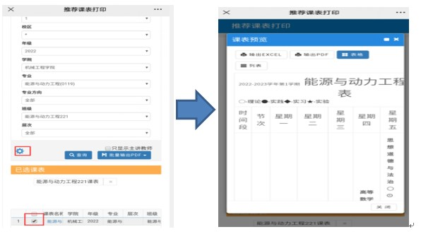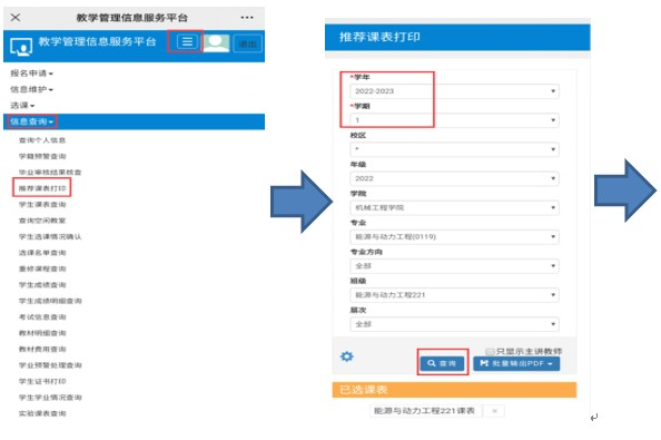 3. 员工选课前应先查询学期推荐课表,了解班级当前学期每门专业课的上课时间,在完成专业课选课后,合理选择公共体育课和校选课。推荐课表查询方法:信息查询→推荐课表打印→输入“学年、学期”→单击“查询”。