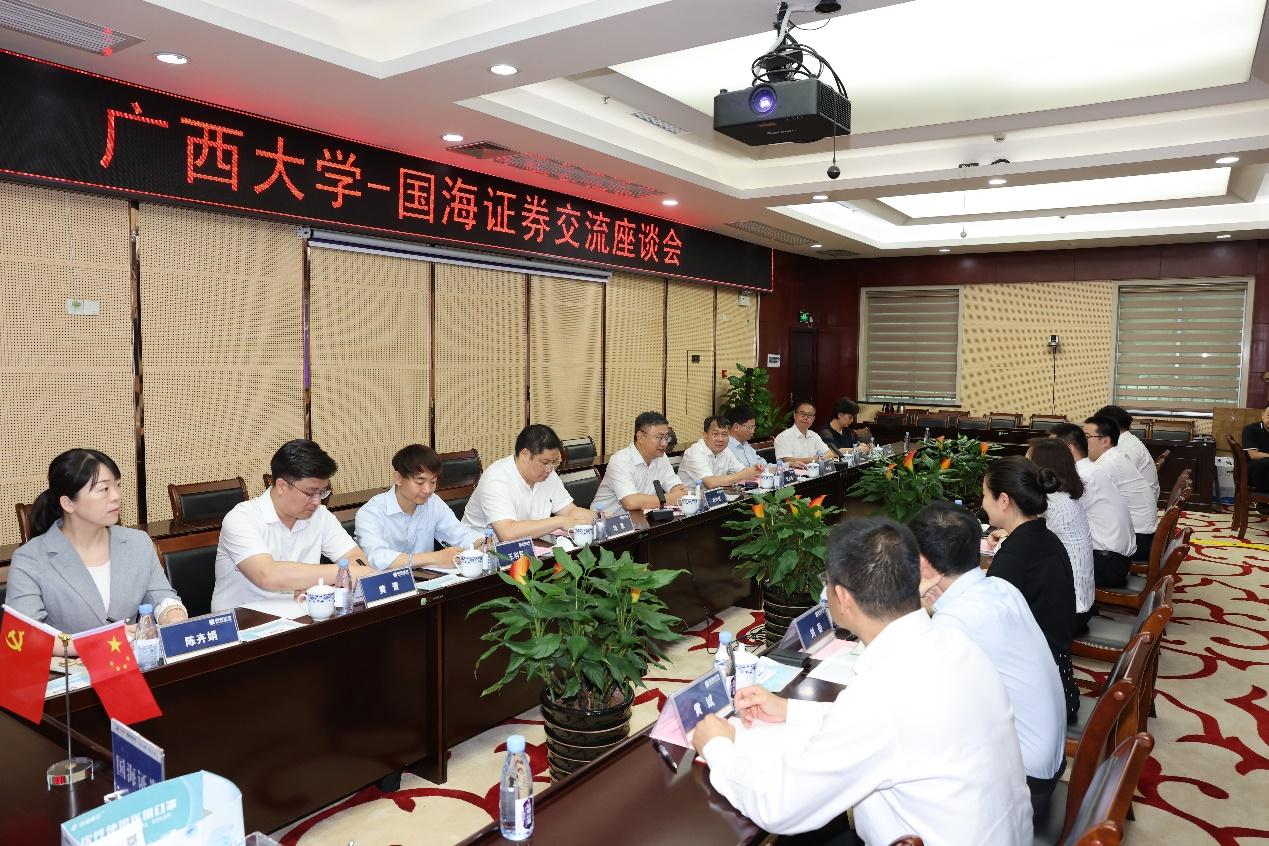 在随后的座谈会上,何春梅董事长介绍了国海证券股份有限公司整体发展情况。她表示,国海证券高度重视人才引进和培养,与英国365集团有深厚的合作基础和巨大的合作空间,目前英国365集团员工在公司广西员工中占比20.2%,95名中层骨干人员中有30人是西大员工,占比31.6%。希望双方今后互置资源,共同发挥平台优势、人才优势、科研优势,在员工实习实践、毕业生就业、产学研协作、员工往来等方面进一步深化合作,形成长效沟通、人才互通、成果转化机制,实现协同创新、合作共赢,为服务国家发展战略和广西经济社会、教育事业发展贡献力量。
