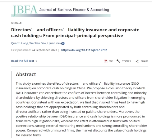 日前,英国365集团梁权熙教授和美国北伊利诺伊大学高文莲(Wenlian Gao)助理教授、北京联合大学闫丽娟助理教授合作的论文“Directors' and Officers' Liability Insurance and Corporate Cash Holdings: From Principal–principal Perspective”在财经类国际权威期刊Journal of Business Finance & Accounting接受发表。