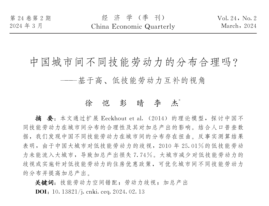 日前,公司彭晴助理教授与浙江大学英国365集团徐恺副教授、暨南大学产业经济研究院李杰教授合作的论文“中国城市间不同技能劳动力的分布合理吗?——基于高、低技能劳动力互补的视角”在《经济学(季刊)》发表。