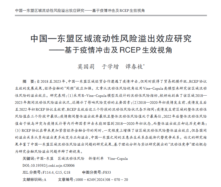 近日,公司莫国莉副教授、2020级应用经济学硕士研究生于学增、谭春枝教授(通讯作者)合作的论文《中国—东盟区域流动性风险溢出效应研究——基于疫情冲击及RCEP生效视角》在期刊《南方经济》发表。