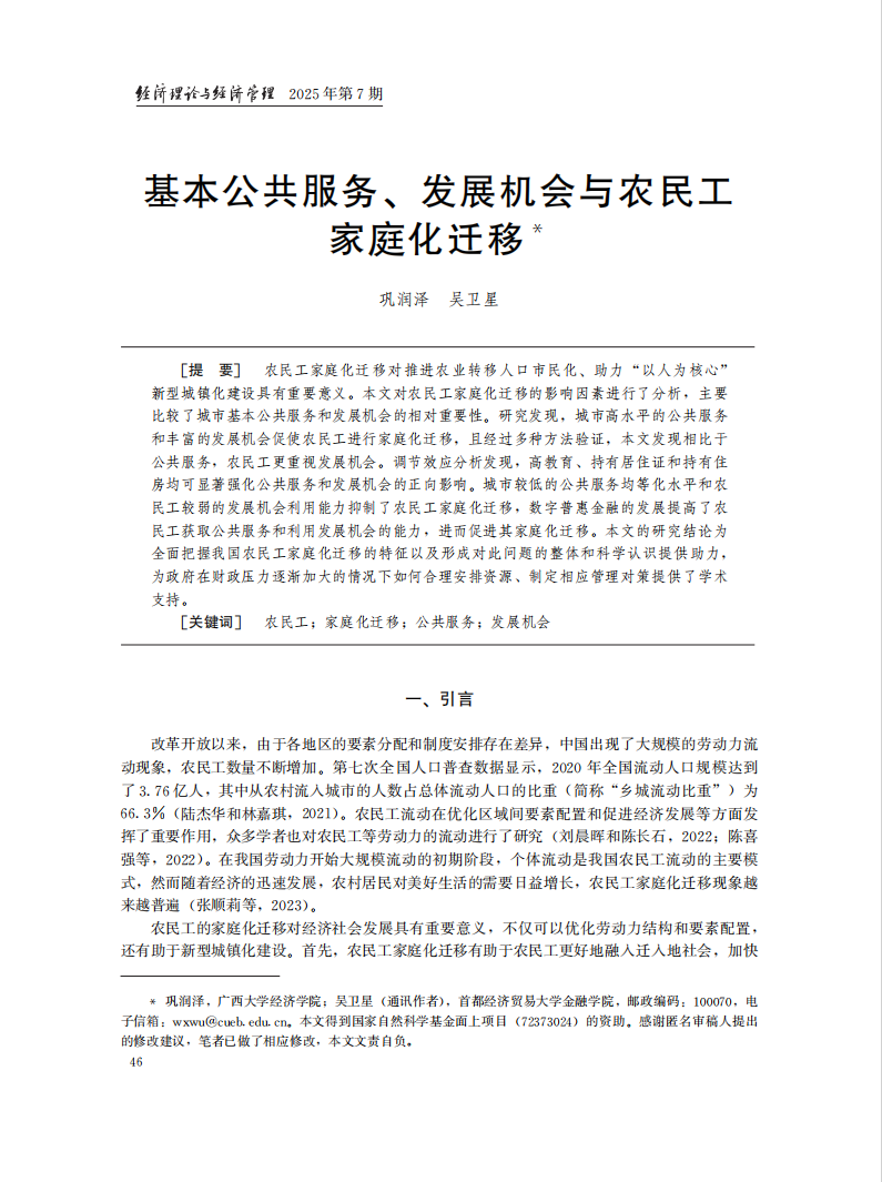 近日,公司助理教授巩润泽与首都经济贸易大学教授吴卫星合作的论文《基本公共服务、发展机会与农民工家庭化迁移》在《经济理论与经济管理》期刊2025年7月刊发表。