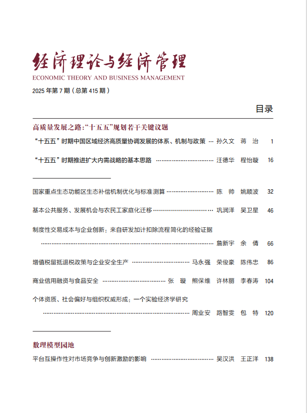 《经济理论与经济管理》创刊于1981年,是由中华人民共和国教育部主管、中国人民大学主办的国家级综合性经济期刊。《经济理论与经济管理》注重研究深度和学术规范,关注经济现实,讲求理论与实践相结合。该刊主要组织刊发两类文章:一类是具有原创性的纯理论文章,强调理论创新、思想深度和思辨性;另一类是熟练运用经济数量分析技术和实证方法、理论联系实际、有新的观点和发现的文章。经济理论与经济管理》的主要栏目有:理论探索、学术前沿、经济热点、公共经济、金融研究、产业经济、区域经济、新农村建设、工商管理、国际经济、动态与综述等。刊被以下数据库收录:北大核心、CSSCI、AMI核心、社科基金资助期刊。(2024版)复合影响因子:5.233,(2024版)综合影响因子:3.017。