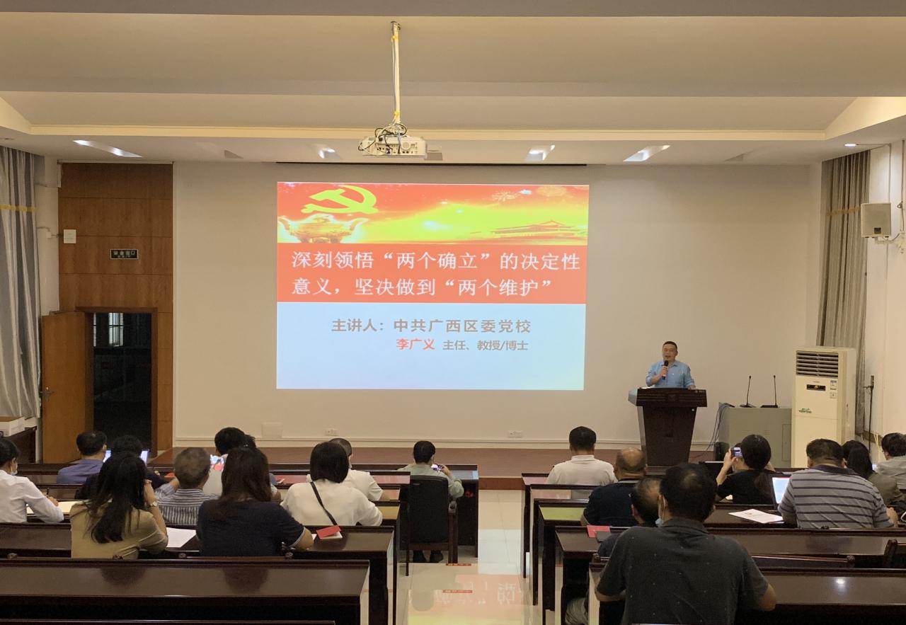 主题党日活动首先邀请中共广西区委党校(广西行政公司)哲学教研部主任、广西壮族自治区党委讲师团特聘专家李广义教授,为两个教工支部党员讲授了以“深刻领悟‘两个确立’的决定性意义,坚决做到‘两个维护’”为主题的党课,深入学习党的二十大精神。李教授从“两个确立”决定性意义的理论和实践逻辑;完整准确把握“两个确立”的内涵要求;坚持“两个确立”,做到“两个维护”,开创新时代壮美广西建设新局面三个方面,深刻解读了“两个确立”和“两个维护”重要意义,并对党的二十大精神进行了深入的阐述。参会党员教师专心听讲,认真记录,进一步深入理解了党的二十大精神内涵,更好的理解了“两个确立”是推进中华民族伟大复兴历史进程最根本的保证,必须始终同以习近平同志为核心的党中央保持高度一致,把“两个确立”转化为坚决做到“两个维护”的自觉行动。