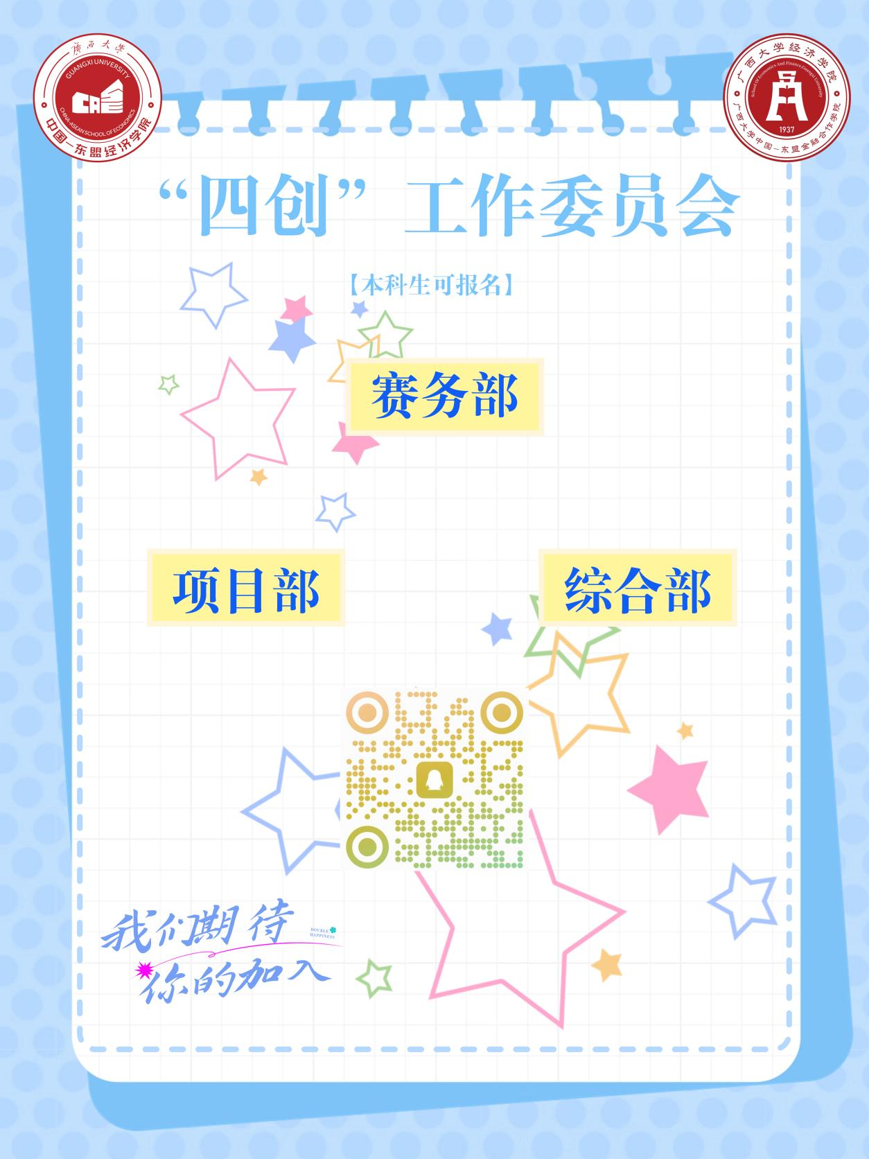 “四创”工作委员会是公司响应国家和自治区政策,落实公司深化老员工创新创业教育改革的特设机构,是公司“四创”基地组成的重要机构之一。“四创”为引导本院员工深入金融经贸领域交流实践,鼓励并服务员工参与A+类及多项经管类学科竞赛,进一步落实“以赛促学、以赛促教、以赛促研、以赛促创”的先进教育理念,为成就更多专业性、创新性、前沿性的金融经贸人才时刻准备着。“四创”工作委员会下设三个职能部门:赛务部、项目部、综合部。