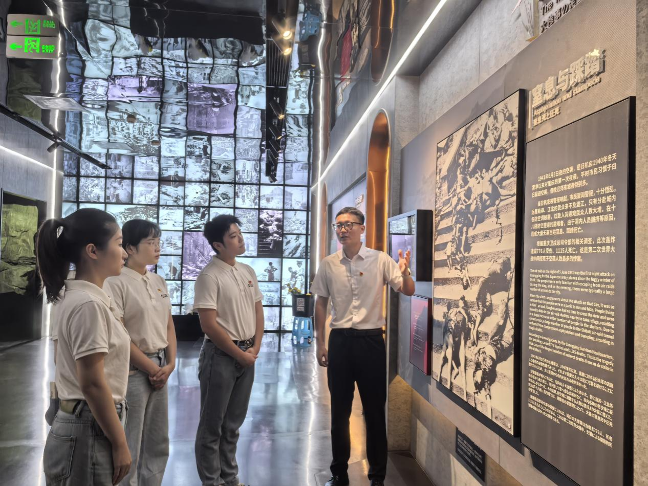在“六·五”隧道惨案遗址,公司团委书记、本科生第三党支部书记王海希老师聚焦“愈炸愈强”的抗战精神,回顾了日机狂轰滥炸下重庆的惨烈状况,特别讲述了师生们在防空洞中坚持上课、“读书不忘救国,救国不忘读书”的动人场景。王海希老师强调,这种“把课堂当战场,把学问当武器”的壮举,生动诠释了抗战精神中“百折不挠”、“坚忍不拔”的伟大信念。她勉励青年党员铭记历史、珍视和平,将这份精神内化为奋斗动力,挺膺担当,书写无愧于使命的时代答卷。