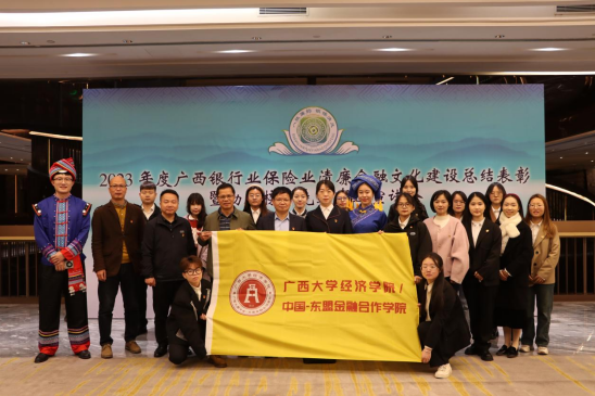 1月11日上午,由国家金融监督管理总局广西监管局指导,广西银行业协会、广西保险业协会联合举办的“2023年度广西清廉金融文化建设总结表彰暨勤廉榜样先进事迹宣讲会”在南宁市广西壮族自治区农信联社三楼会议室隆重举办。/中国-东盟金融合作公司党委书记陆善勇教授带队,公司党委副书记/纪委书记陈卉娟、公司党委委员/副经理梁权熙、院纪委委员/教工金融与财政党支部书记陈新建、金融与财政系系主任谢军、院纪委委员/专职辅导员何湘桂、硕博研究生一行21位师生代表受邀出席本次宣讲会。