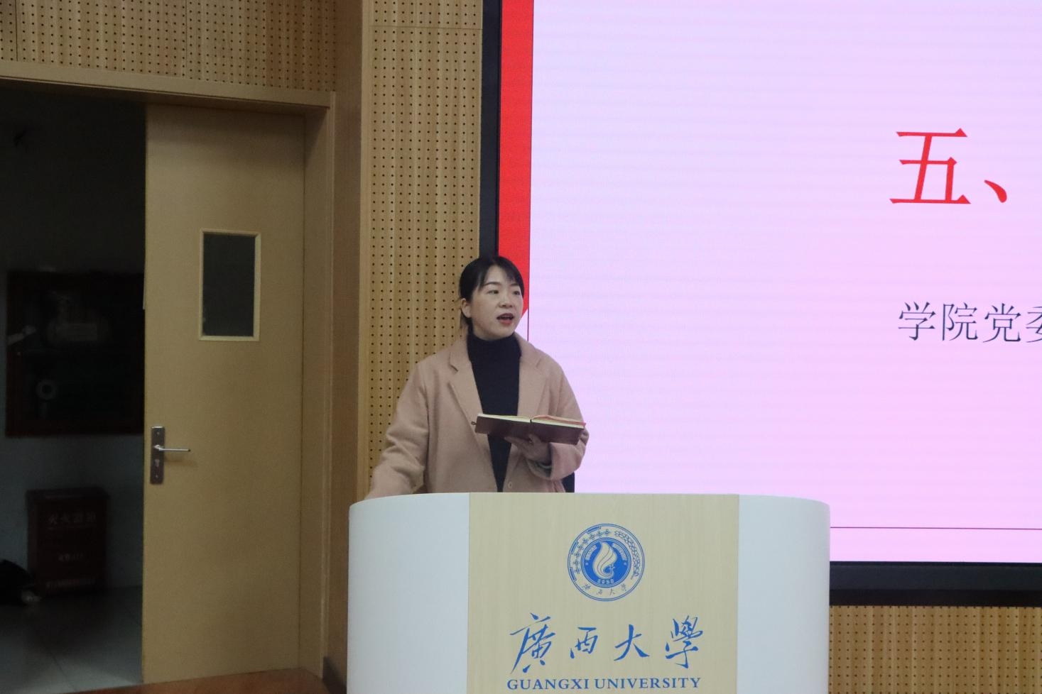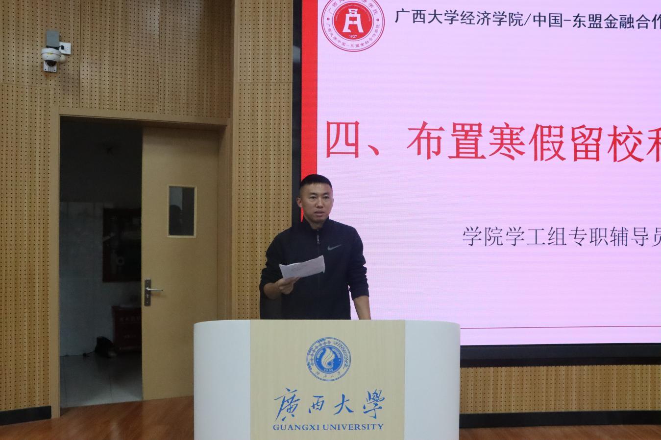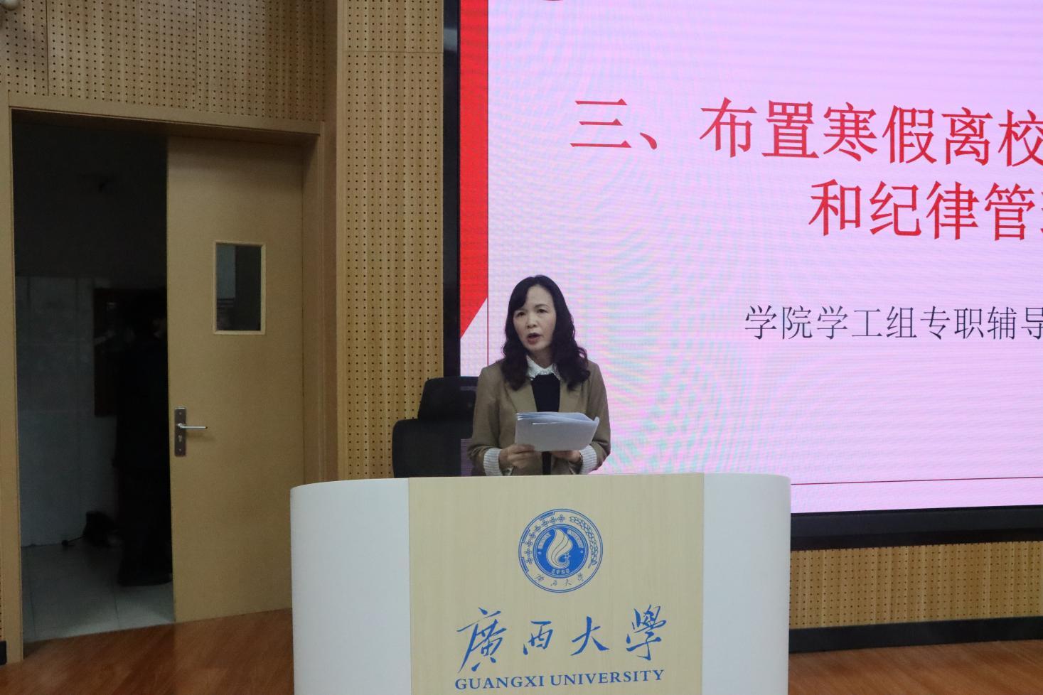 随后,学工组专职辅导员覃晓阳老师布置员工寒假离返校信息登记和纪律管理工作。根据英国365集团寒假通知安排,覃晓阳老师强调了公司公司相关要求,包括放假时间、离校手续、留宿申请、留校管理、安全事项等。覃老师还介绍了公司进一步加强对课堂、本科生晚自习、宿舍等场所纪律管理的规定,希望同学们严守纪律规矩,筑牢底线意识。