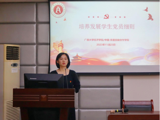 公司专职辅导员何湘桂老师讲解公司培养发展员工党员细则。何老师首先对目前公司员工发展党员的具体情况向大家作了说明,并详细介绍了公司培养发展员工党员的流程、条件和要求,提高了入党积极分子对公司培养发展员工党员过程的认识。她希望同学们都能够端正态度,对自己高标准严要求,在各个方面以党员的标准严格要求自己,不断为成为一名光荣的中国共产党党员而努力。