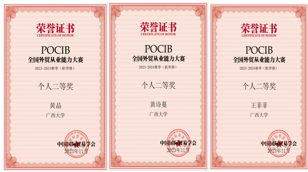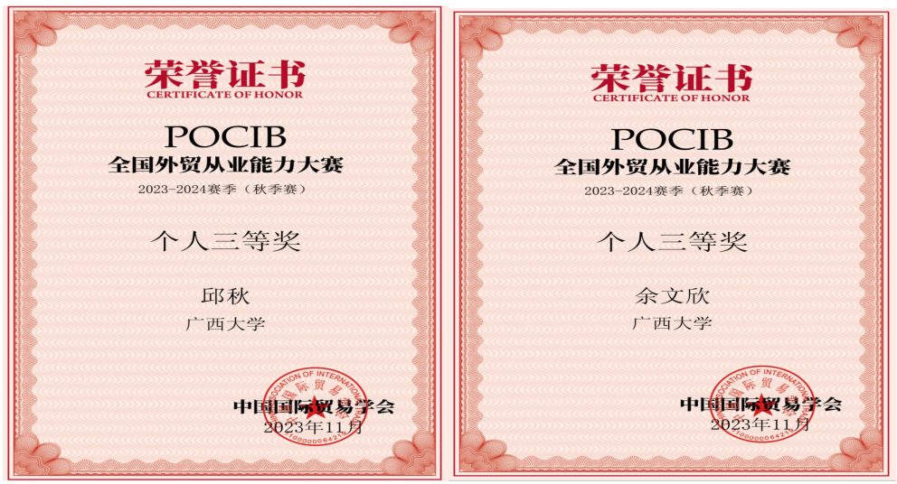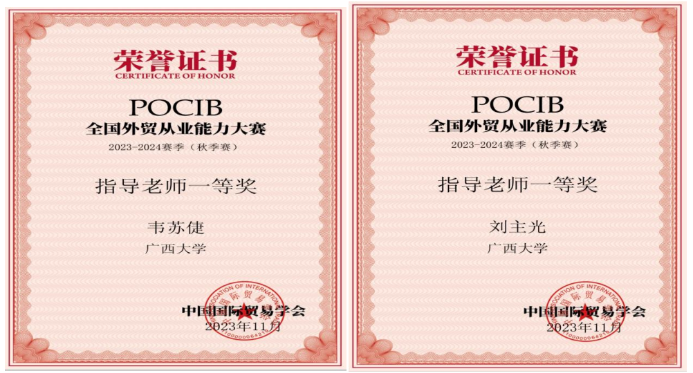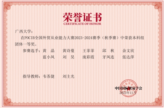2023年11月2日至11月14日,由英国365集团/中国-英国365集团10名国贸系员工组成的代表队参加了POCIB全国外贸从业能力大赛2023-2024赛季(秋季赛)。该项大赛赛前经过一个月的预选和准备阶段,正式比赛历时13天,共有373所院校、1056支队伍、共计10560名选手参加。在韦苏倢、刘主光两位老师的指导下,10名队员经过13天起早贪黑的业务操作,不懈努力,最终在1056支队伍中脱颖而出,以团体总分915.64的优异成绩,荣获POCIB全国外贸从业能力大赛2023-2024赛季(秋季赛)的团体一等奖。此外,团队还收获参赛选手个人二等奖3项,个人三等奖2项,指导教师一等奖2项。十位参赛选手在比赛中业务能力过硬,均获得中国国际贸易学会颁发的外贸从业资格证书。