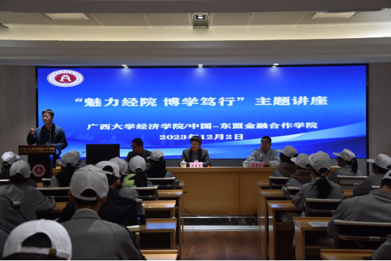 第三站,隆安中学师生们来到公司参加“魅力经院 博学笃行”主题讲座。公司党委书记陆善勇教授介绍了公司和公司概况,并对隆安中学的同学们提出了殷切希望,希望同学们未来能成长为支持广西地方经济社会发展的有用之才;副经理梁权熙教授在指出公司实力强劲的同时,为同学们介绍了经济学类专业在当今形势下的重要性、就业前景以及未来的发展潜力;接着,经理助理陈伟宏博士从自身经历出发,向同学们讲解如何兼顾专业学习与综合能力提升;最后,隆安中学朱勇付老师对公司的活动安排表示感谢,通过这次研学,同学们对老员工活和学习有了一定了解,希望同学们能更好地规划未来的学习。