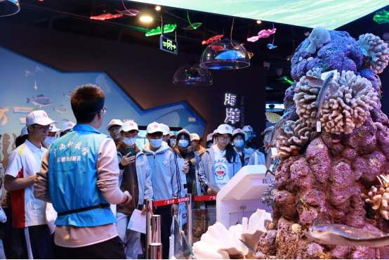 第二站是参观公司海洋科教馆。馆内多种多样的海洋动物、丰富多彩的鱼类、历史悠久的海洋生物标本、贝类、珊瑚类、矿石类、水晶……吸引了隆安中学同学们驻足观看。