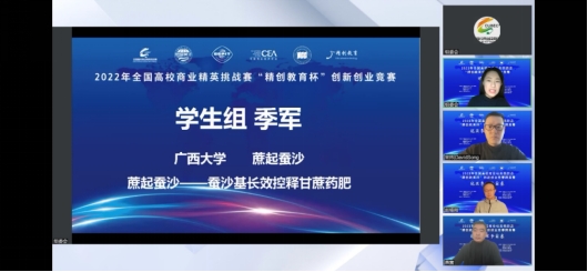近日,2022年全国高校商业精英挑战赛“精创教育杯”创新创业竞赛全国总决赛(第二阶段)精英赛圆满收官。在公司的大力支持下,在国贸系陈伟宏助理教授和化学化工公司赵钟兴教授的共同指导下,公司“蔗起蚕沙”参赛队积极筹备精英赛,凭借《蔗起蚕沙—蚕沙基长效控释甘蔗药肥》项目的精彩路演与线上答辩,从全国71支入围精英赛的团队中脱颖而出,最终斩获全国总决赛精英赛季军,获得2000元的现金奖励以及水晶奖杯。