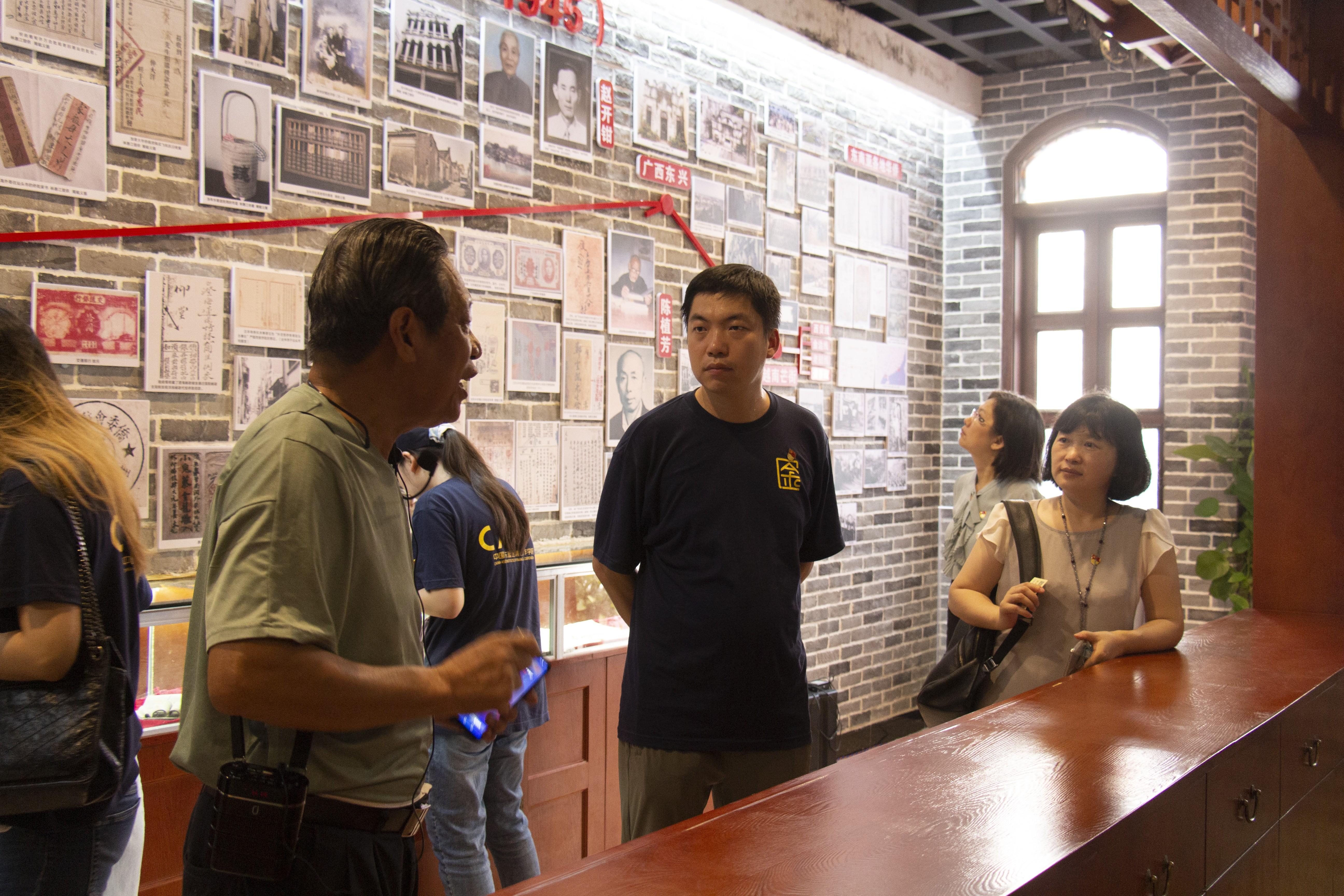 沿着石板路一路往前,我们来到了东兴侨批馆。侨批馆立面早已斑驳,馆前小广场伫立着一个跨步前行的“批脚”铜像。侨批专指海外华侨通过海内外民间机构寄至国内的汇款暨家书。解说员带领我们参观馆内藏物,并向我们细心讲解了侨批馆的历史由来和相关事迹,令在场的成员都为先辈们冒着兵荒马乱和路途曲折之险送批的大无畏精神所动容。