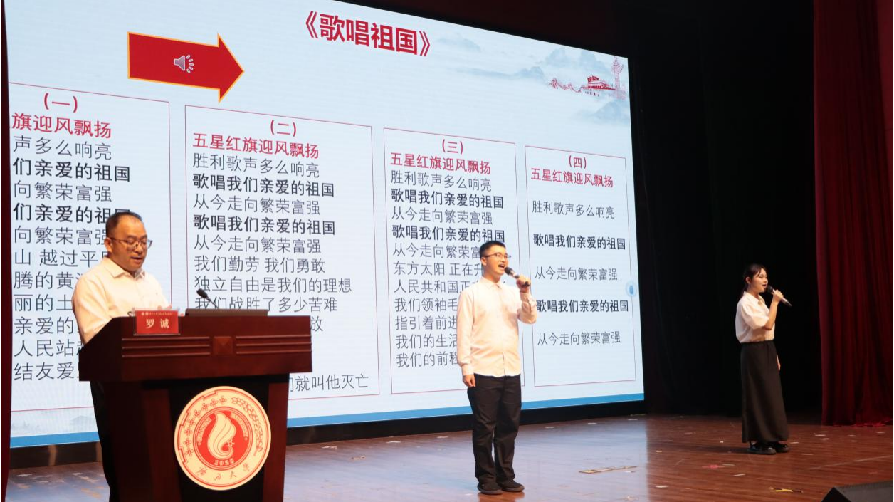 课堂上,为增强教学效果,罗诚还邀请了经济231班的唐咏荷同学和国贸231班的饶名扬同学现场领唱《没有共产党就没有新中国》和《歌唱祖国》,在昂扬激越的旋律中,全体新生重温了党的百年奋斗历程,感受到党的光辉伟大,将现场气氛推向高潮。