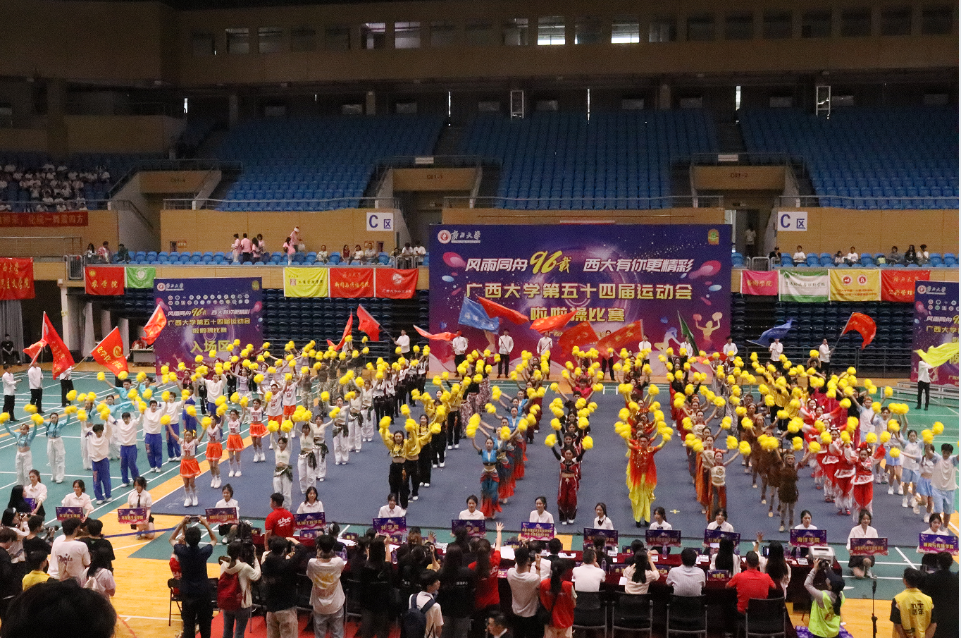 公司啦啦操代表队以整齐划一的队形,充满活力与创意的表演动作设计,赢得了现场评委老师们的认可。大家齐声高呼“经世济民,力争奋进;学通中外,时不我待”的口号,公司观众席上加油声、呐喊声此起彼伏,气势磅礴。