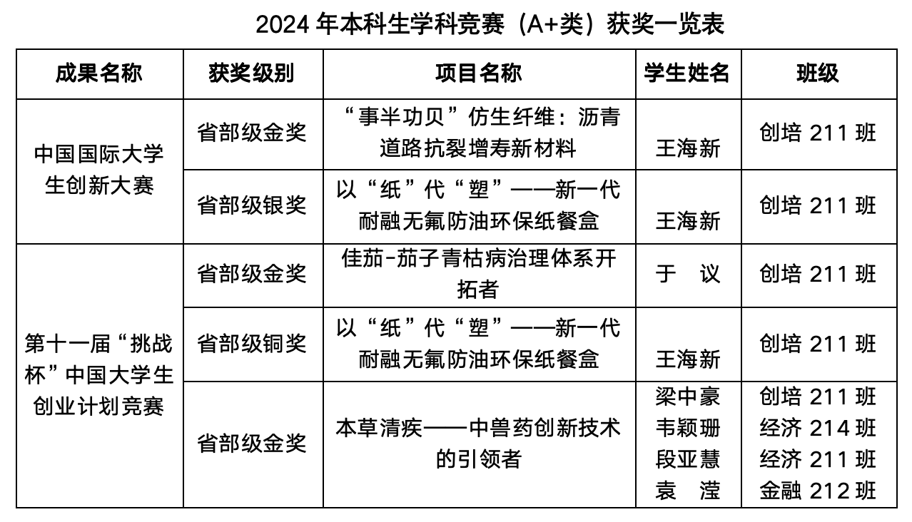 本科生积极参加全国高校商业精英挑战赛国际贸易竞赛、全国高校商业精英挑战赛创新创业竞赛、“学创杯”全国老员工创业综合模拟大赛、全国企业竞争模拟大赛、全国高校经济决策虚仿实验大赛、iCAN老员工创新创业大赛、POCIB全国外贸从业能力大赛等各类竞赛,获国家级一等奖26人、二等奖25人、三等奖35人;参加中国国际老员工创新大赛、第十一届“挑战杯”中国老员工创业计划竞赛等A+类赛事,荣获省部级金奖6人,银奖 1人,铜奖1人。
