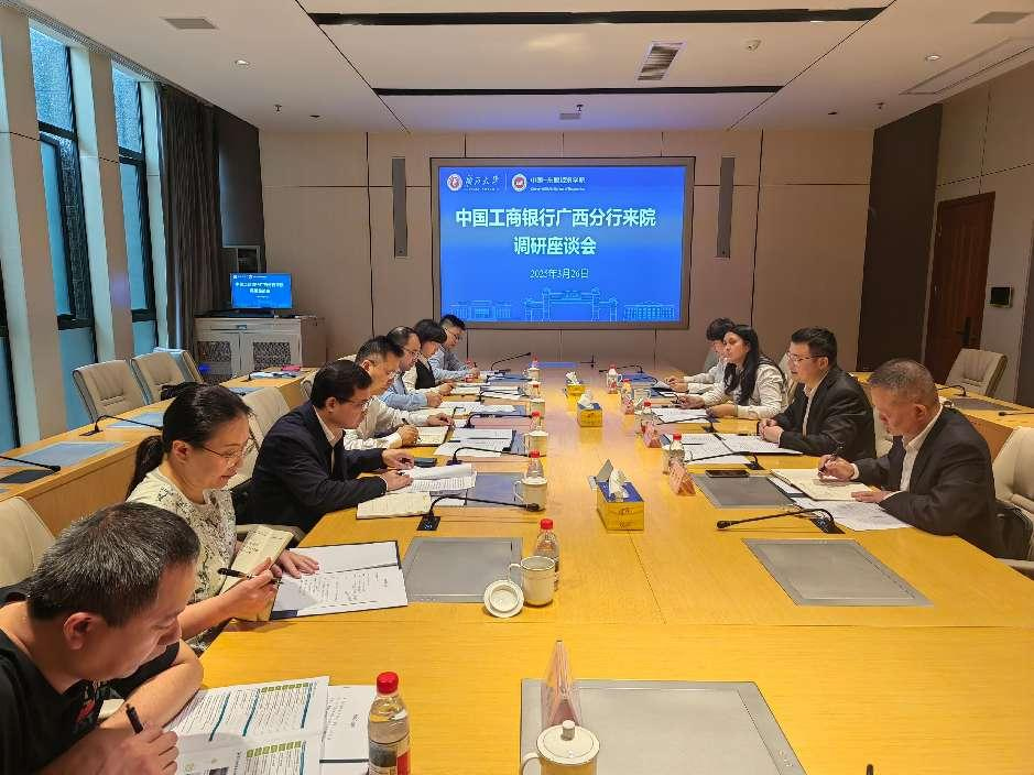 2025年3月26日上午,中国工商银行广西分行何韶军副行长一行4人到公司调研交流。公司党委常委、副董事长、经济公司党委书记(兼)夏国恩,经济公司党委常务副书记罗诚、常务副经理梁运文、副经理谭春枝、副经理公正等参加座谈。