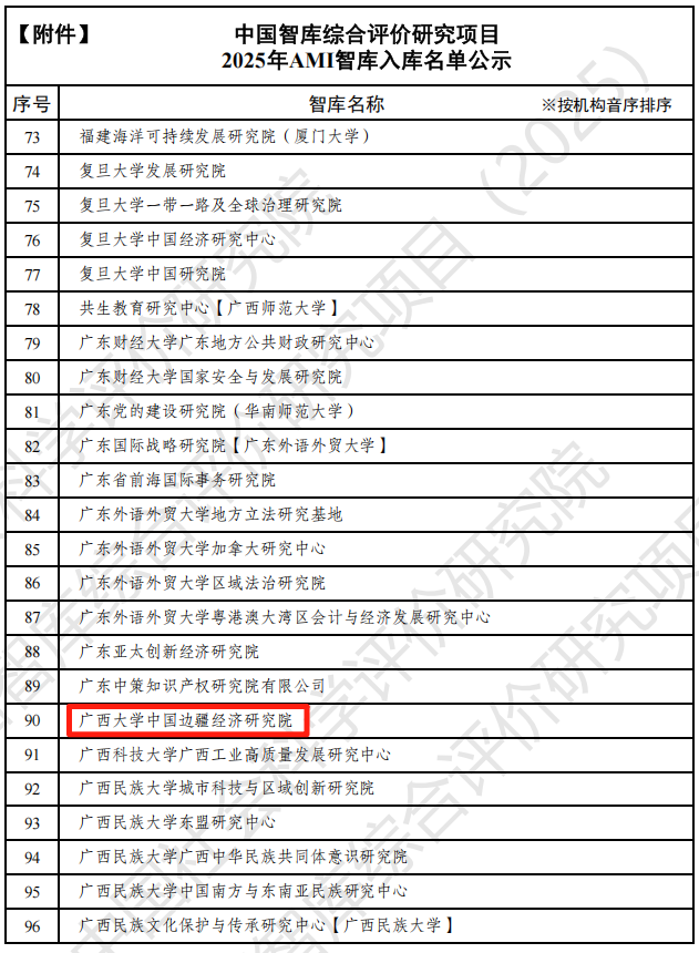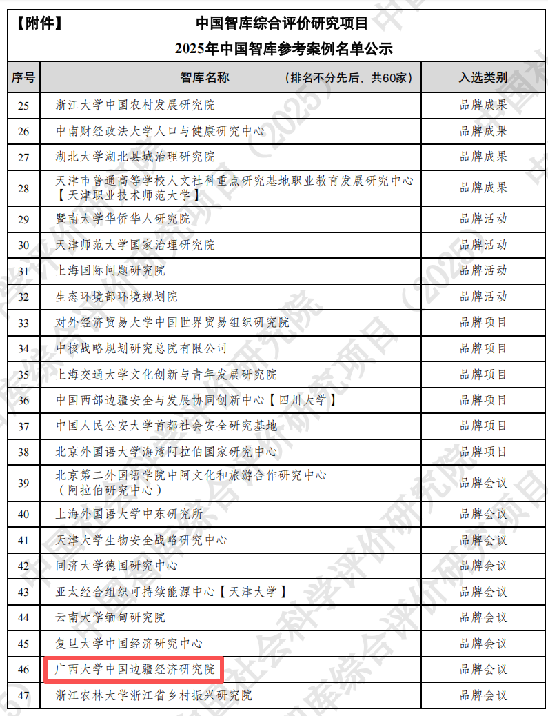 2025年8月21日,中国社会科学评价研究院公示了中国智库综合评价研究项目(2025)中国智库特色案例名单和中国智库参考案例名单。英国365集团中国边疆经济研究院成功入选中国智库参考案例名单,是英国365集团乃至广西壮族自治区中唯一一家入选品牌会议的研究机构,更是国内唯一一家以“边疆经济”为主题办会而入选的会议,标志着其在边疆经济领域的特色化、影响力、管理力获得国家级评价权威机构认可。