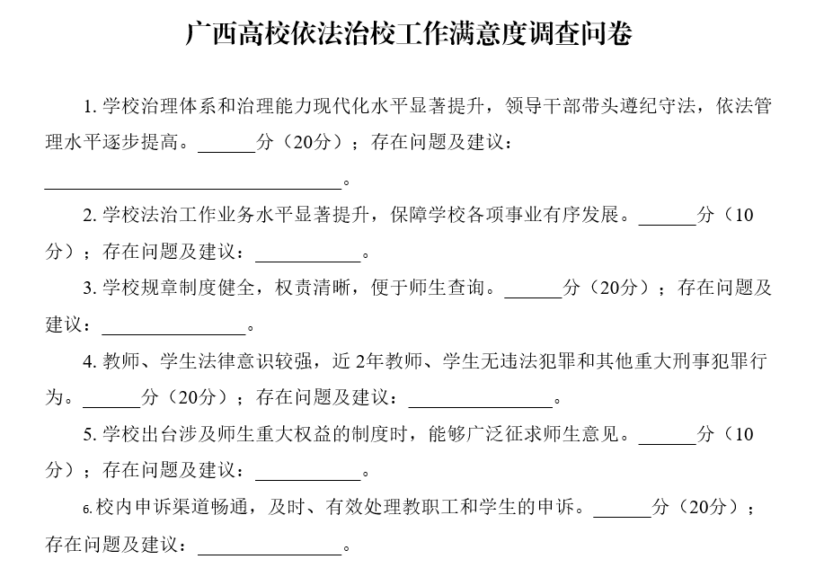 为贯彻落实教育部、自治区党委关于积极开展依法治校达标建设和示范校创建工作的相关精神,推进公司依法治校工作高水平发展,按照《自治区教育厅 自治区司法厅关于开展全区大中小公司依法治校达标建设和示范校创建评估工作的通知》 (桂教政法(2023)4号) 的部署和要求,需以网络问卷的形式开展依法治校工作满意度调查。